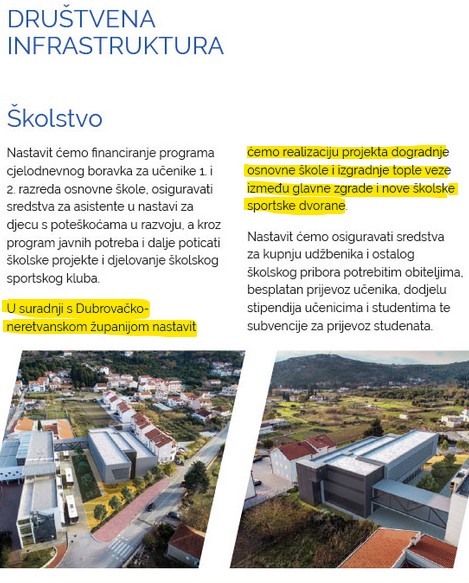 O temi nedostatka kapaciteta u župskoj školi pisali smo i prije tri godine, tad se „privremeno“ iskoristilo prostore KIC-a Antun Miloslavić prenamjenom u učionice kako bi se zadržao jednosmjenski rad škole. „Privremeno“ rješenje je na snazi i danas, a davno obećani aneks škole nalazi se u fazi „projektne dokumentacije“ bez jasnih rokova realizacije. Projekt dogradnje aneksa škole prigodno se nalazio u nekoliko izbornih programa vladajućih, pa tako i u onome sa zadnjih izbora koji možete vidjeti na fotografiji, a vjerojatno će se nalaziti i u predstojećem dogodine. Ostaje nejasno zašto se barem nije išlo u izgradnju tople veze između zgrade škole i sportske dvorane, odnosno zbog čega je to nepotrebno vezano uz projekt aneksa.