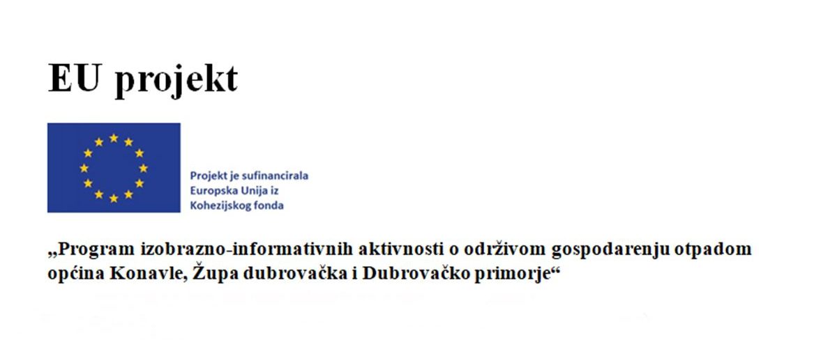 Riječ je o projektu pod nazivom “Program izobrazno – informativnih aktivnosti o održivom gospodarenju otpadom općina Konavle, Župa dubrovačka i Dubrovačko primorje”. Vrijednost samog projekta iznosila je 511.955.99 kuna, od čega je 85 % iznosa sufinancirano od strane EU fondova. Projekt je proveden na području općina Konavle, Župa dubrovačka i Dubrovačko primorje, te je obuhvatio 10 izobrazno – informativnih aktivnosti čiji je glavni cilj bio podizanje razine svijesti stanovnika triju navedenih općina o odgovornom postupanju s otpadom.